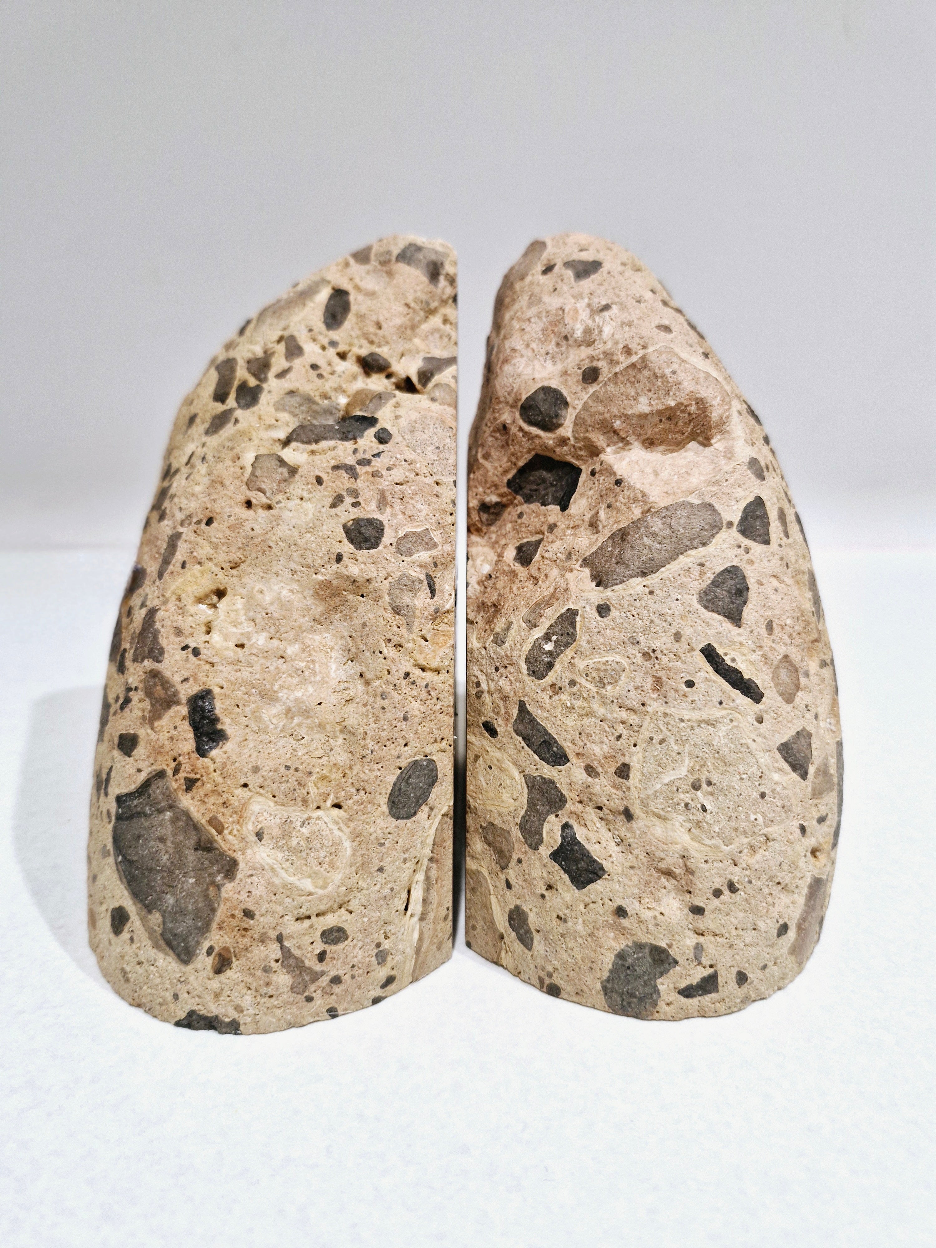 Carefully crafted and polished, this unique set of bookends, feature embedded flecks of naturally occurring stone patterns that mimic the multicolored, confetti-like effect of terrazzo.