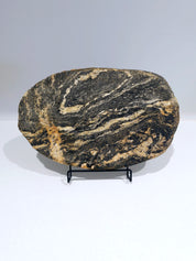 Gneiss is often considered beautiful because of its striking banded appearance. The natural, organic flow of the bands can evoke a sense of movement, almost like waves or layers of a landscape. Each piece of gneiss is unique, this one is no exception!