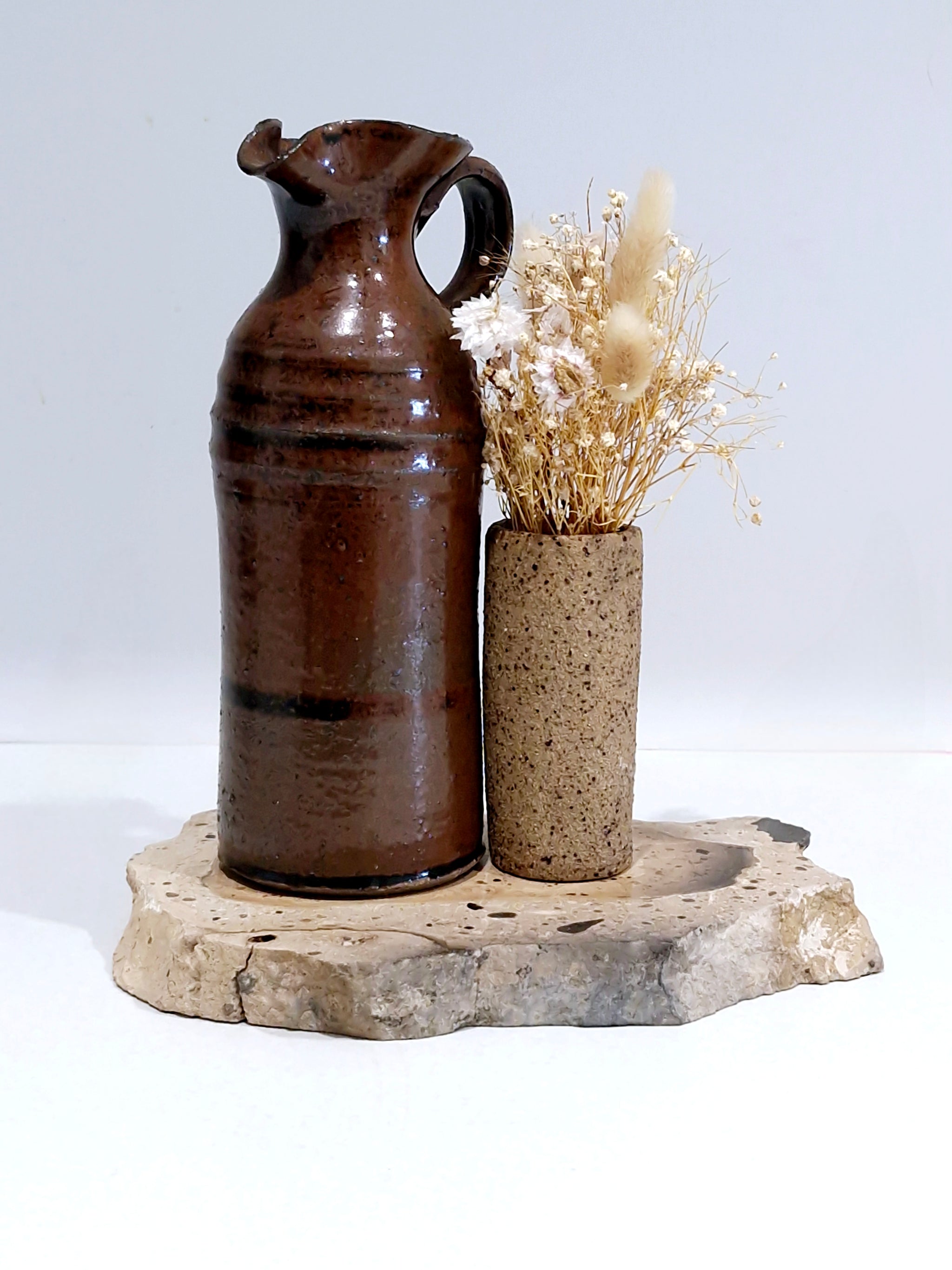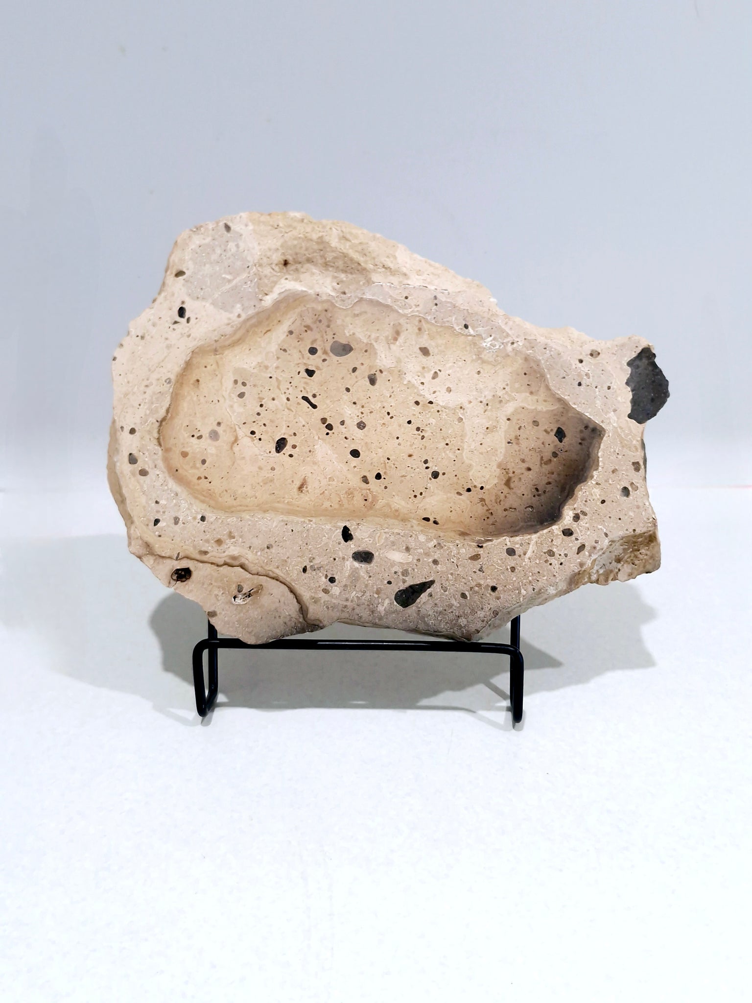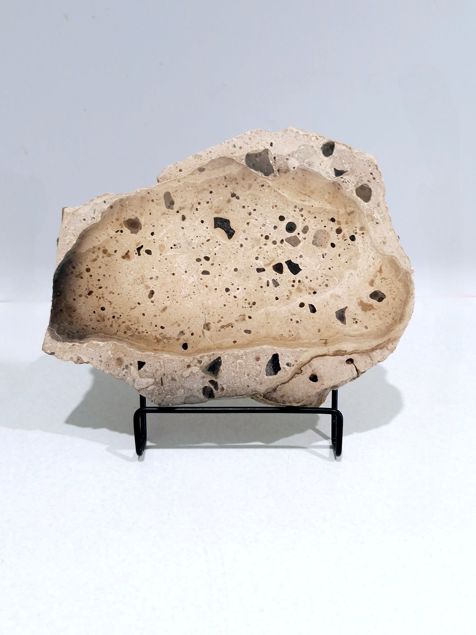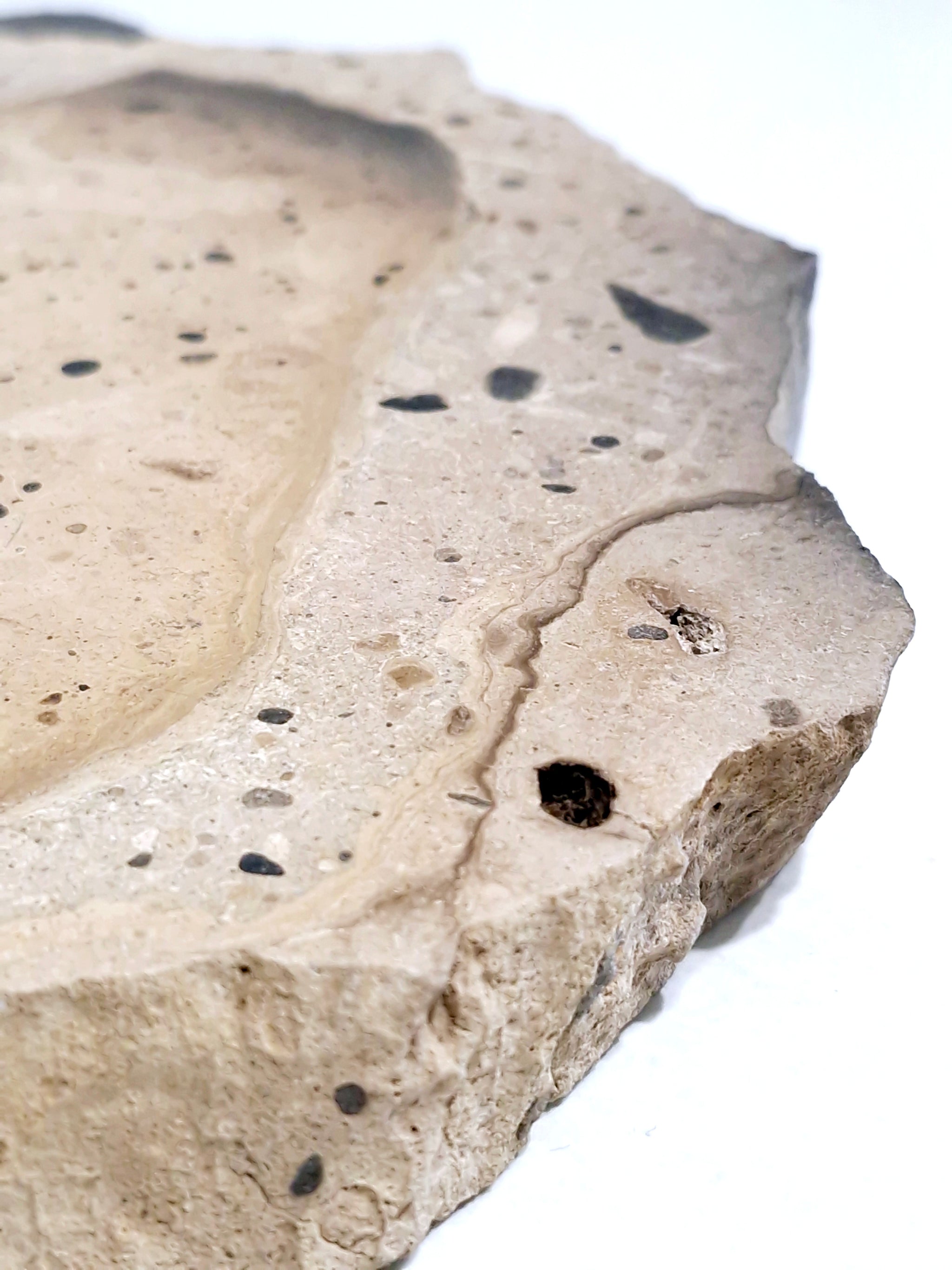 A creamy stone piece adorned with bold charcoal swirls and delicate flecks, its smoky undertones and raw edge exude natural charm. The charcoal colours enhance the organic texture, bringing an effortless sophistication to any space.